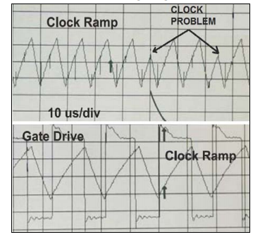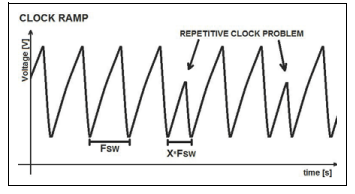 如果石英振蕩器有噪聲感應(yīng)電壓在上升坡道上的尖峰,門檻將被越過(guò)早些時(shí)候,時(shí)鐘信號(hào)會(huì)比它早應(yīng)該,如圖所示,這也將提前開始低坡道在圖中,這導(dǎo)致切換的突然變化PWM信號(hào)的頻率和高抖動(dòng),該時(shí)鐘斜坡非常容易受到PCB布局的影響芯片周圍的元件,因此,除非開關(guān)頻率在內(nèi)部產(chǎn)生,易受影響蝕刻和元件會(huì)引入噪聲額外的抖動(dòng),這種行為可以避免,或者至少可以避免通過(guò)遵循適當(dāng)?shù)腟MPS布局規(guī)則最小化.
