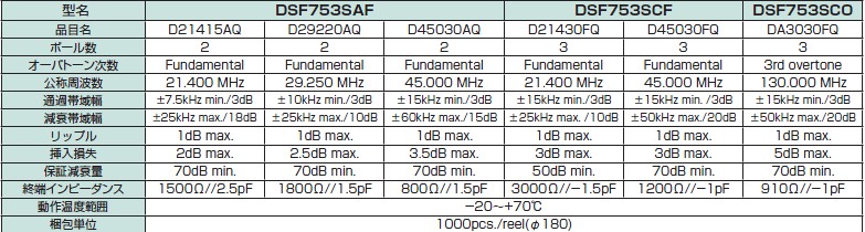 KDS貼片濾波器,聲表面濾波器DSF753S,對講機(jī)濾波器,外形尺寸:7.0×5.0×1.3,小型?輕量(0.15g)SMD類型通過單體實(shí)現(xiàn)4POLE特性,保證衰減量特性卓越耐撞擊性,耐振動性卓越,被應(yīng)用于商務(wù)無線等無線通信機(jī),小型表面貼片型標(biāo)準(zhǔn)晶體諧振器,適用于寬溫范圍的辦公自動化"1D21407AQ3",家電電器及汽車附件等領(lǐng)域??蓪?yīng)8MHz以上的頻率,在辦公自動化,家電相關(guān)電器領(lǐng)域可發(fā)揮優(yōu)良的電氣特性,滿足無鉛焊接的回流溫度曲線要求.