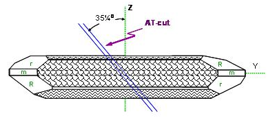 在各種不同種類的切割角度方式中, AT角度切割的石英芯片適用在數(shù)MHz到數(shù)佰MHz的頻率范圍,是石英芯片應(yīng)用范圍最廣范及使用數(shù)量最多的一種切割應(yīng)用方式. 在(如圖)中, 從"7M-12.000MAAJ-T"石英晶棒X-軸向的上視圖, 可以看到對(duì)Z-軸向旋轉(zhuǎn)約35度的AT 方向. 這在大量生產(chǎn)的技術(shù)上也是很好達(dá)成的一種作業(yè)方式.