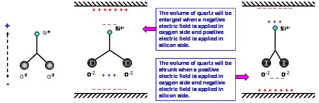 氧原子的水平位置變化時(shí), 鄰近的另一個(gè)氧原子會(huì)相對(duì)的產(chǎn)生排斥或吸引的力量, 迫使氧原子回到原來(lái)的空間位置. 因此, 電場(chǎng)的力量與原子之間的力量會(huì)相互牽動(dòng), 電場(chǎng)的改變與水平方向的形變是形成交互作用狀態(tài). 這個(gè)交互作用會(huì)形成一個(gè)在石英材料耗能最小的振動(dòng)狀態(tài), 祇要由電場(chǎng)持續(xù)給與能量, 石英材料"9HT11-32.768KAZF-T"就會(huì)與電場(chǎng)之間維持一個(gè)共振的頻率. 這個(gè)壓電效應(yīng)下氧原子的振幅與電場(chǎng)強(qiáng)度及電場(chǎng)對(duì)二氧化硅的向量角度有相對(duì)應(yīng)的關(guān)系.在實(shí)際的應(yīng)用上, 電場(chǎng)是由鍍?cè)谑⑿酒系慕饘匐姌O產(chǎn)生, 電場(chǎng)與二氧化硅的向量角度則是由石英晶棒的切割角度來(lái)決定.