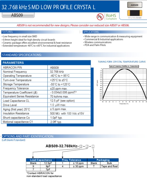 | ABS09-32.768KHZ-T | Abracon晶振 | ABS09 | kHz Crystal (Tuning Fork) | 32.768kHz | 2-SMD, No Lead |