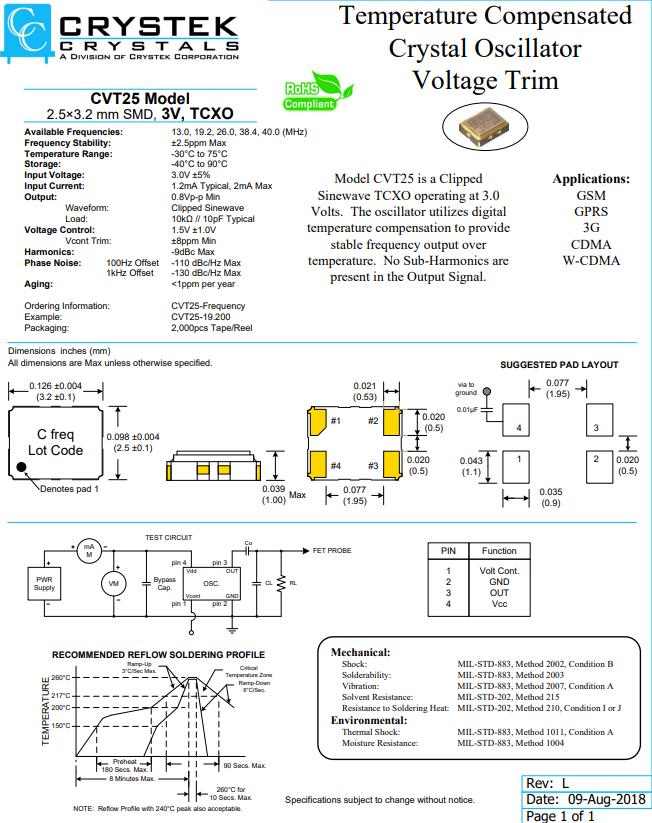 | CVT25-19.200 | CRYSTEK振蕩器 | CVT25 | TCXO | 19.2MHz | ±2.5ppm | -30°C ~ 75°C |