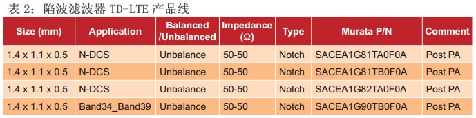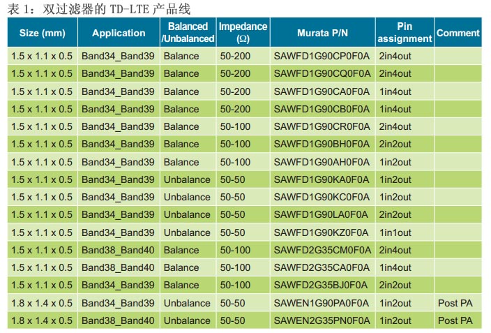 1至3顯示的表面聲波(SAW)的產(chǎn)品線表TD-LTE,村田制作所發(fā)布了到目前為止濾波器.雙濾波器列于表1,表2和表3中的陷波濾波器,單濾波器.