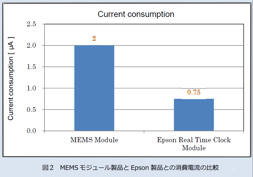 MEMS模塊產品,音叉石英晶體都是一樣的,難以實現(xiàn)低頻率,所以比較容易制造數百KHz成都的產品,用以時鐘的振蕩頻率和作為目的的頻率分周.圖二所示的是EPSON模塊產品和MEMS模塊的產品耗電說明.