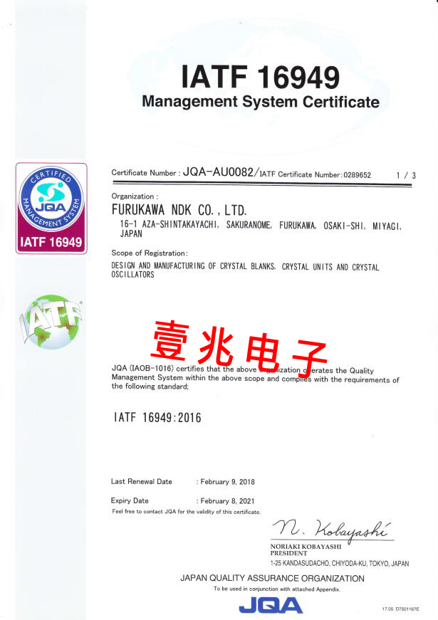 - [2019-07-01]日本NDK晶振IATF 16949汽車認(rèn)證...